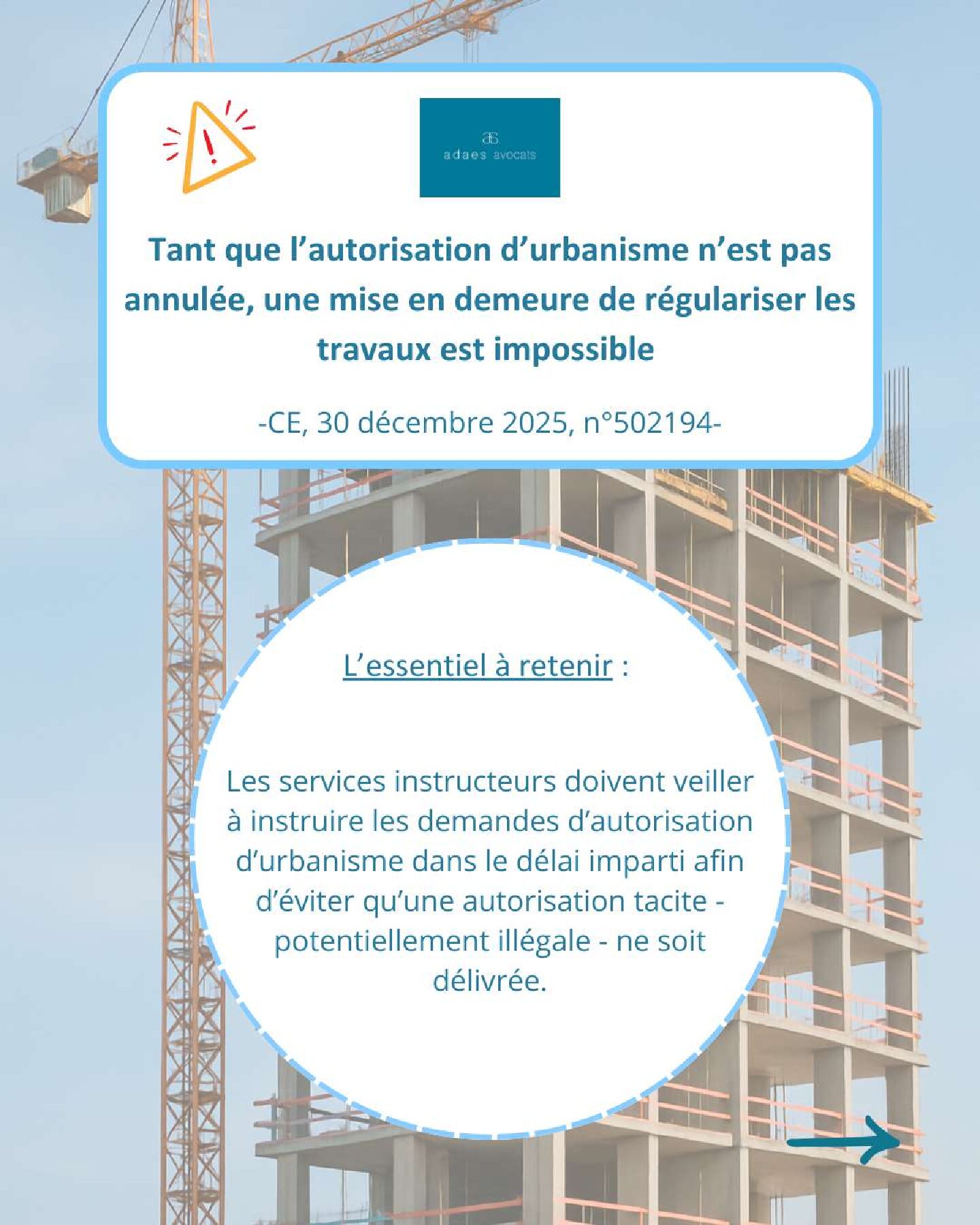 Tant que l’autorisation d’urbanisme n’est pas annulée, une mise en demeure de régulariser les travaux est impossible CE, 30 décembre 2025, n°502194 L’autorité compétente pour délivrer une autorisation d’urbanisme ne peut…
